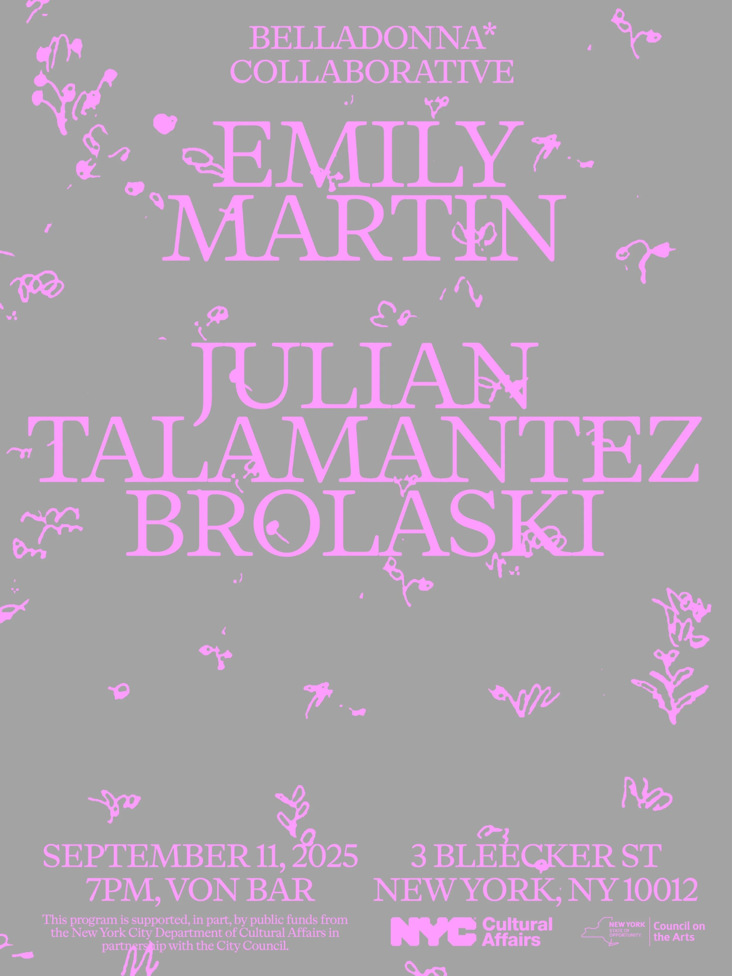 Poets Emily Martin and Julian Talamantez Brolaski will begin this Fall season of Belladonna*’s reading and chaplet series, curated by Bahaar Ahsan.