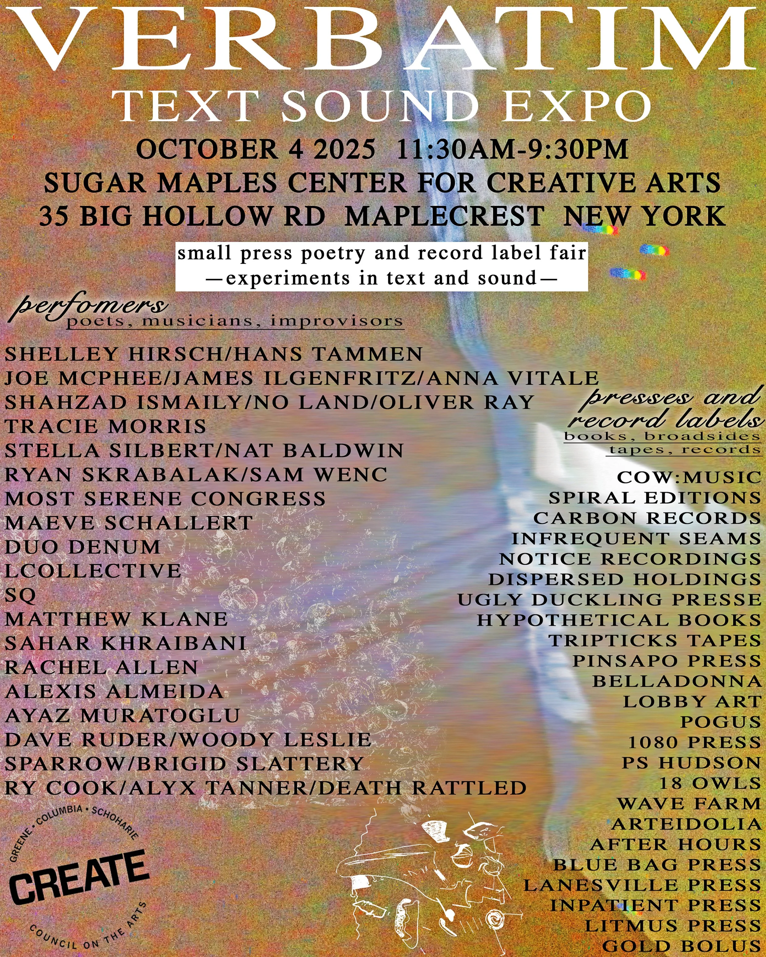 Join us on October 4th at Sugar Maples Center for Creative Arts in Maplecrest, NY for Verbatim Text Sound Expo. We will be tabling alongside incredible independent presses and labels, and will curate a performance slot featuring readings by Ayaz Muratoglu and Alexis Almeida from 7:10-7:30 at the Performance Church.